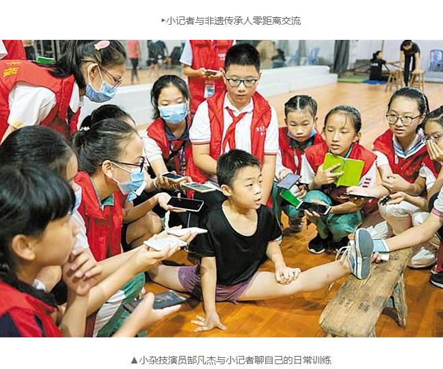 在雜技團(tuán)訓(xùn)練基地,小雜技演員郜凡杰接受了小記者們的采訪,他的故事讓大家感動(dòng)。郜凡杰雖然年僅9歲,但遠(yuǎn)離家鄉(xiāng)四川來汕學(xué)習(xí)雜技已有很長(zhǎng)時(shí)間,每天練功七、八個(gè)小時(shí),這讓小記者陳璽喬覺得驚訝,“但郜凡杰告訴我們,雖然辛苦,但為了舞臺(tái)上的效果都值得。我很佩服9歲的他,勇敢頑強(qiáng),像個(gè)懂事的小大人?!薄澳敲炊鄮缀醪豢赡茏龅降膭?dòng)作,他們居然都完成了!”探營(yíng)前,小記者陳仲凱很好奇,他們是怎么做到的?采訪中,大演員小演員不約而同給出答案——因?yàn)闊釔鄱鴪?jiān)持?!罢沁@份堅(jiān)持與熱愛的激勵(lì),他們才能不斷前進(jìn),因?yàn)闊釔?,所以?jiān)持;因?yàn)閳?jiān)持,所以熱愛!”陳仲凱說。