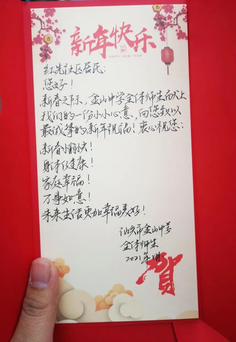參加這次愛心活動之后,同學們對活動的意義與自身的成長有了更深刻的思考。出發(fā)前,一位同學鄭重地捧著精心制作的賀卡說:“我們把心意寫在了賀卡上,這些賀卡承載了我們的愛心,承載了學校對‘鄰居’們的關(guān)切之情?!?/span>