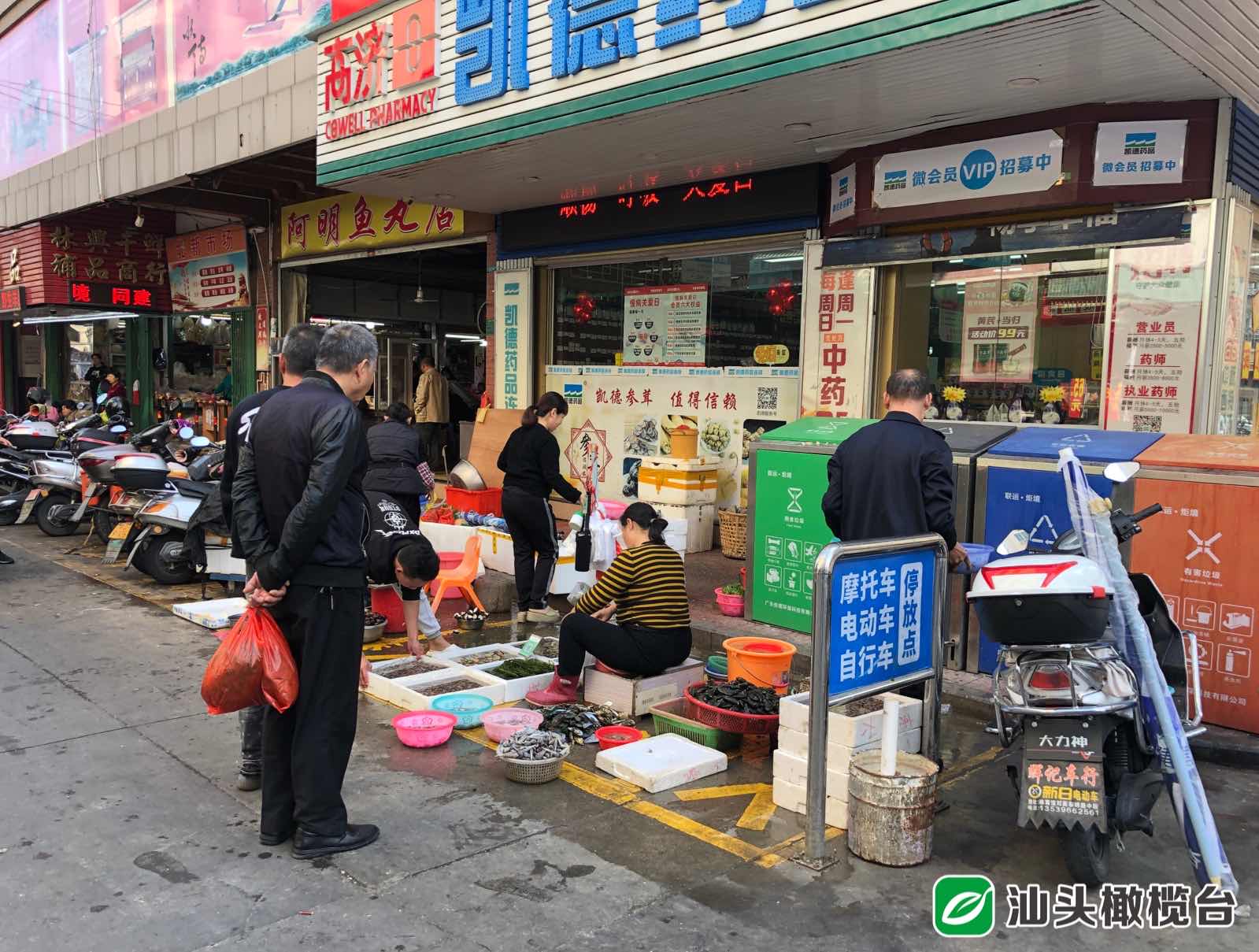 ◆“明華海鮮”將海鮮貨物擺放在人行步道上售賣,地面污水較多。有流動(dòng)攤販占用摩托車、電動(dòng)車劃線停車區(qū)域售賣海鮮。