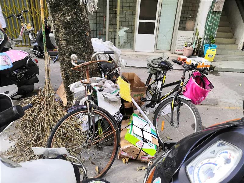 有垃圾隨意丟在龍眼路的垃圾桶旁,共享單車亂停放,有一輛共享單車橫放在馬路上。
