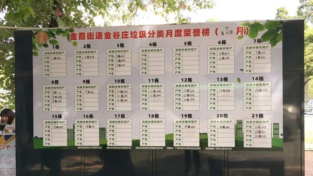 誰家的垃圾分類做得好,也能登上光榮榜!在龍湖區(qū)金霞街道金谷莊區(qū)間道旁的樹蔭下,立著一塊以墨綠色為主色調、寬約3米多的宣傳板,這就是該小區(qū)的垃圾分類月度榮譽榜。