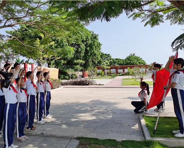 少先隊(duì)輔導(dǎo)員朱映珊主任帶領(lǐng)少先隊(duì)隊(duì)員重溫入隊(duì)誓詞,莊嚴(yán)呼號(hào)!