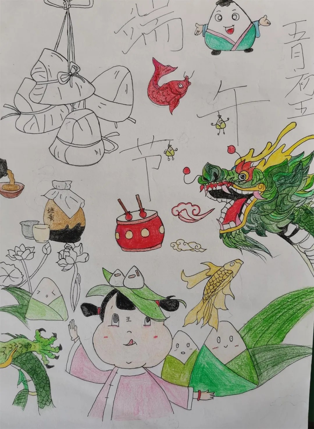 二是開展“手繪端午粽情飄香”的創(chuàng)意小作品制作活動(dòng)。?淡淡粽葉香,濃濃世間情。我校美術(shù)組老師指導(dǎo)同學(xué)們一起小巧手制作的“粽子”,同時(shí),學(xué)校開辟專欄展示同學(xué)們不一樣的“粽子”,不少同學(xué)課間駐足觀賞,讓同學(xué)們不僅感受傳統(tǒng)節(jié)日的魅力,更是體驗(yàn)到勞動(dòng)的快樂(lè),體味勞動(dòng)的意義和價(jià)值。