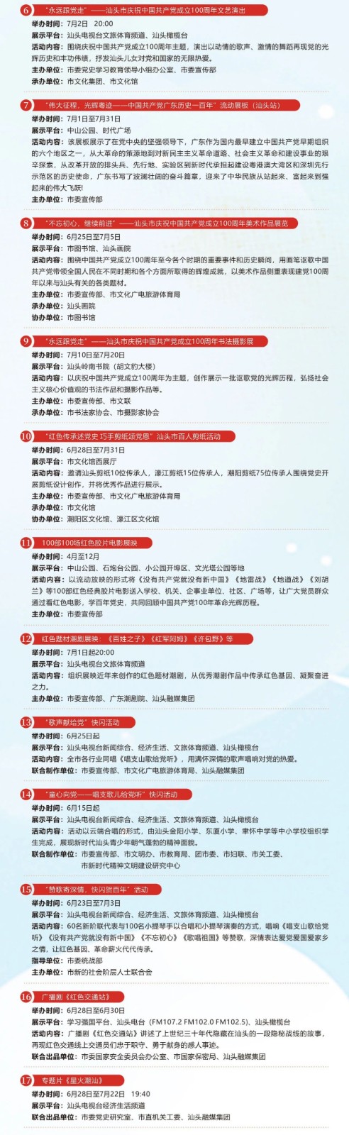 市民群眾將可以通過電視熒幕和手機(jī)客戶端欣賞近年來重點(diǎn)創(chuàng)作的優(yōu)秀紅色題材潮劇作品、音樂作品以及舞臺(tái)藝術(shù)作品。同時(shí)還將播出“歌聲獻(xiàn)給黨”等群眾性快閃活動(dòng)等,用歌聲詮釋對(duì)黨的摯愛和祖國的贊美。