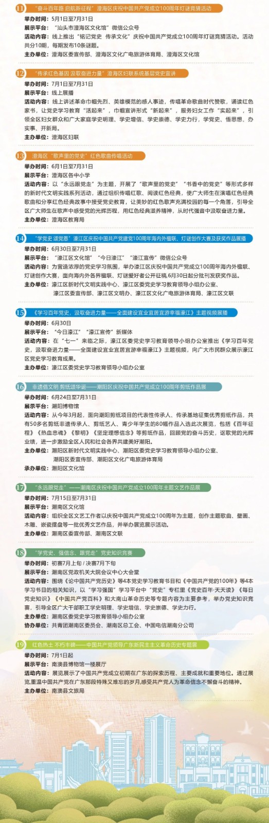其中,特別組織了“永遠(yuǎn)跟黨走”——慶祝中國共產(chǎn)黨成立100周年文藝演出、優(yōu)秀舞臺(tái)藝術(shù)作品展演、紅色題材潮劇展映、美術(shù)作品展、書法攝影展、百人剪紙活動(dòng)等豐富多彩的文化文藝活動(dòng),編排了系列紅色題材潮劇精品以及《紅色交通站》廣播劇等,創(chuàng)作推出一批展示中國共產(chǎn)黨百年輝煌歷程的優(yōu)秀文藝作品。?
