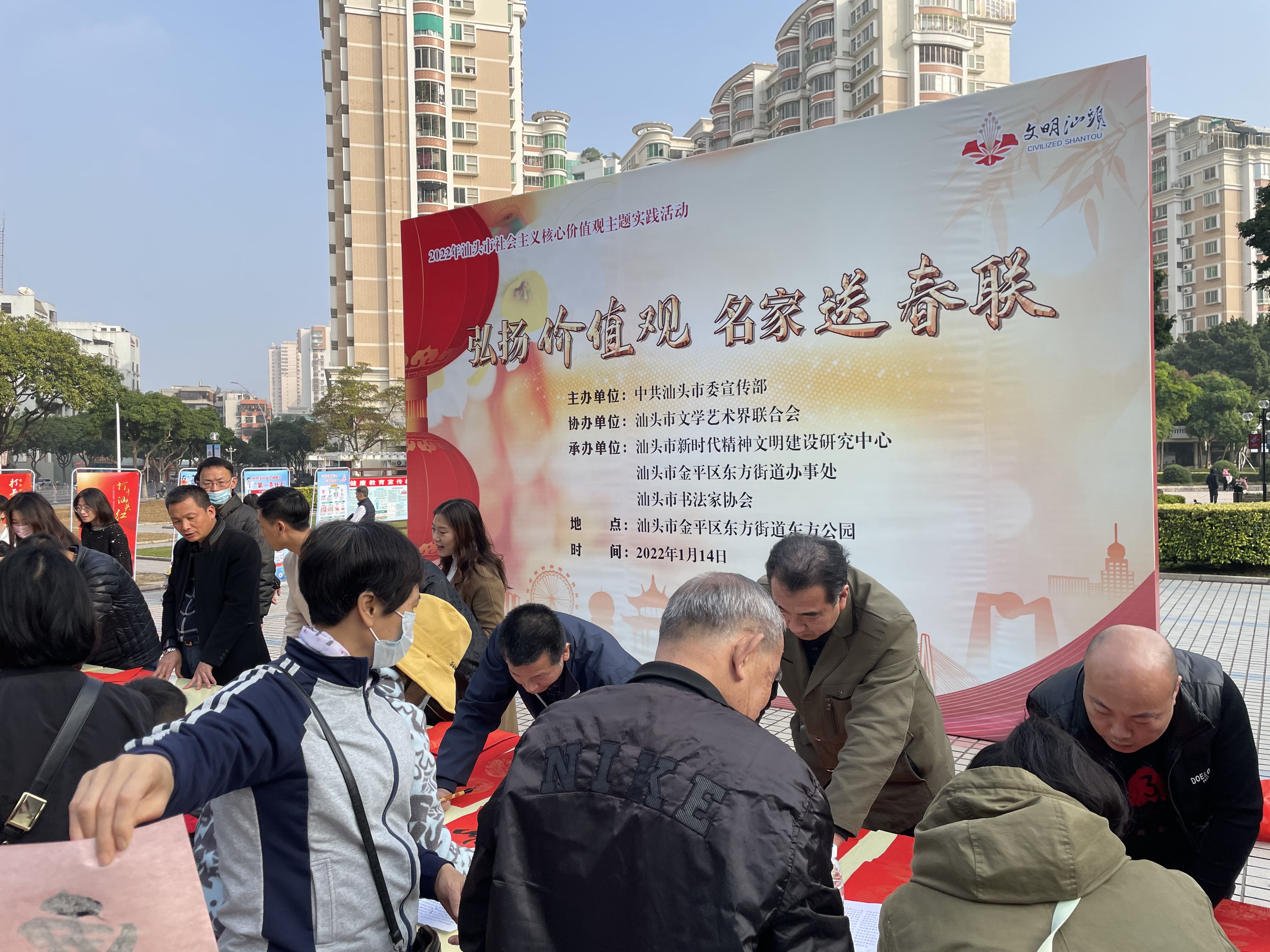 2022年春節(jié)將至,為弘揚社會主義核心價值觀,傳承優(yōu)秀傳統文化,宣傳黨的十九屆六中全會精神,豐富群眾節(jié)日文化生活,營造喜慶、祥和、文明的節(jié)日氛圍,1月14日下午,由市委宣傳部主辦,市新時代精神文明建設研究中心、東方街道辦事處、市書法家協會承辦,市文聯協辦的“弘揚價值觀 名家送春聯”主題活動在金平區(qū)東方公園開展。