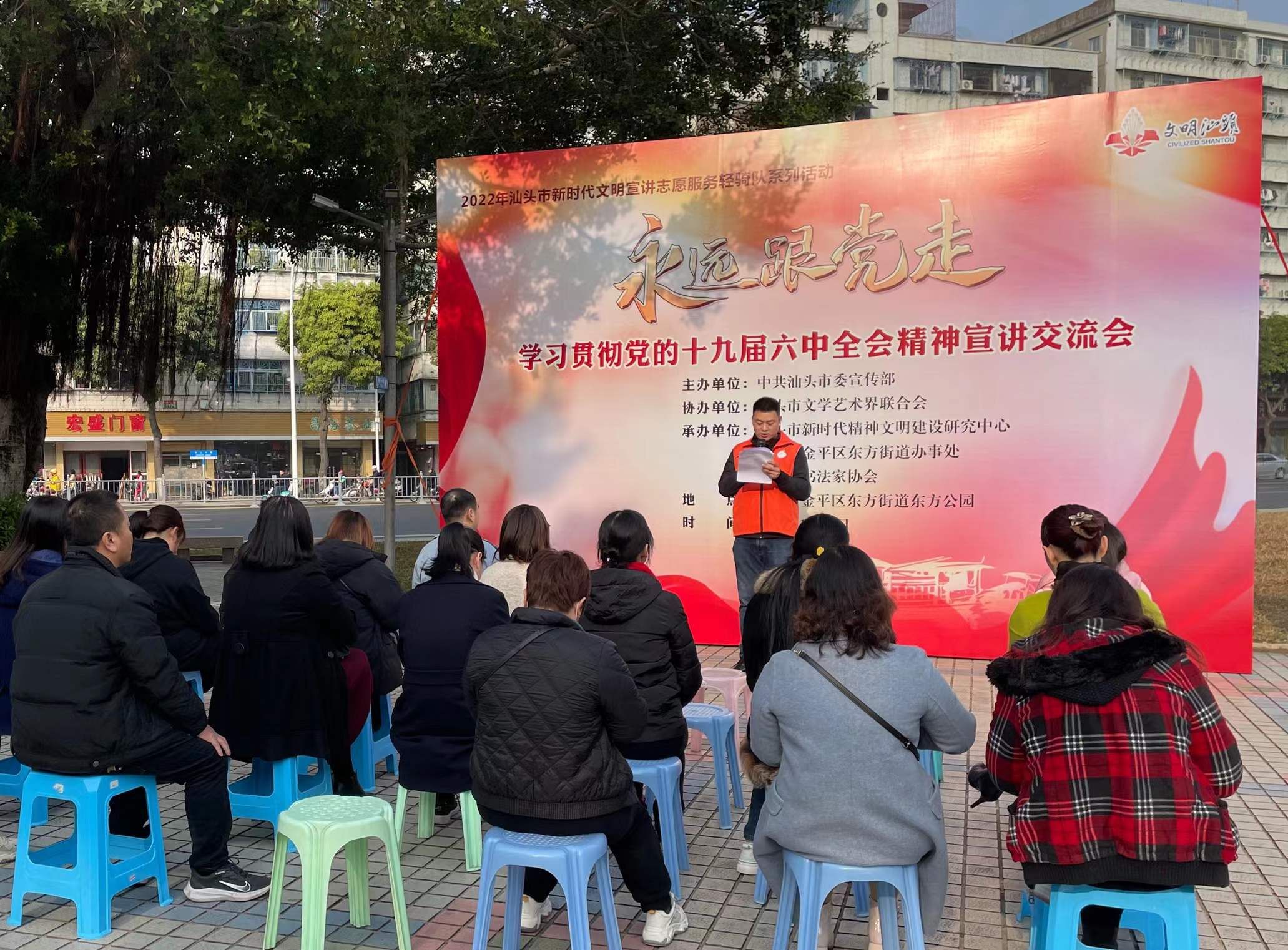 此外,現場還開展了以“永遠跟黨走”為主題的宣講活動,來自市新時代文明宣講志愿服務輕騎隊的志愿者通過“理論宣講+宣傳品展示”的形式,為基層干部群眾宣講黨的十九屆六中全會精神,同時展示汕頭市文明禮儀手冊、黨史學習教育、疫情防控等宣傳資料,深化黨的十九屆六中全會精神學習領悟,切實提高干部群眾的學習成效。