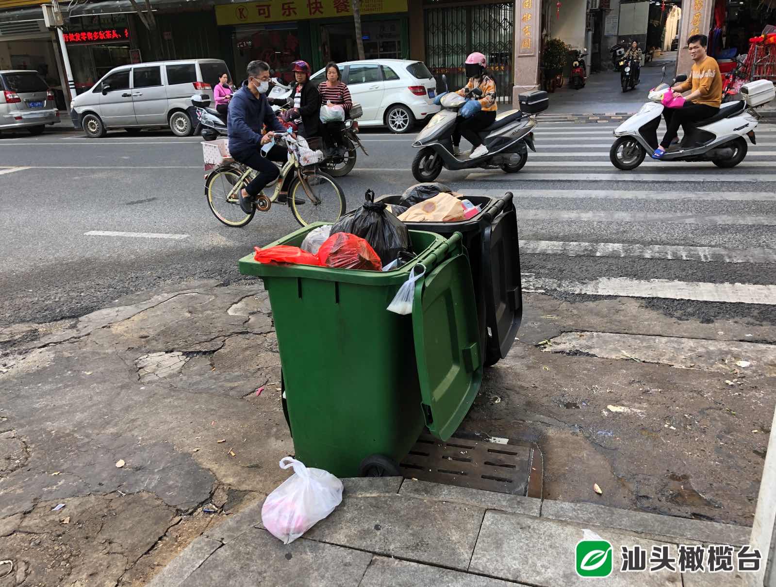◆北關(guān)路有垃圾桶擺放在斑馬線上,垃圾滿溢未加蓋,地面污水較多。周邊多家沿街商鋪占用人行道擺放貨品。