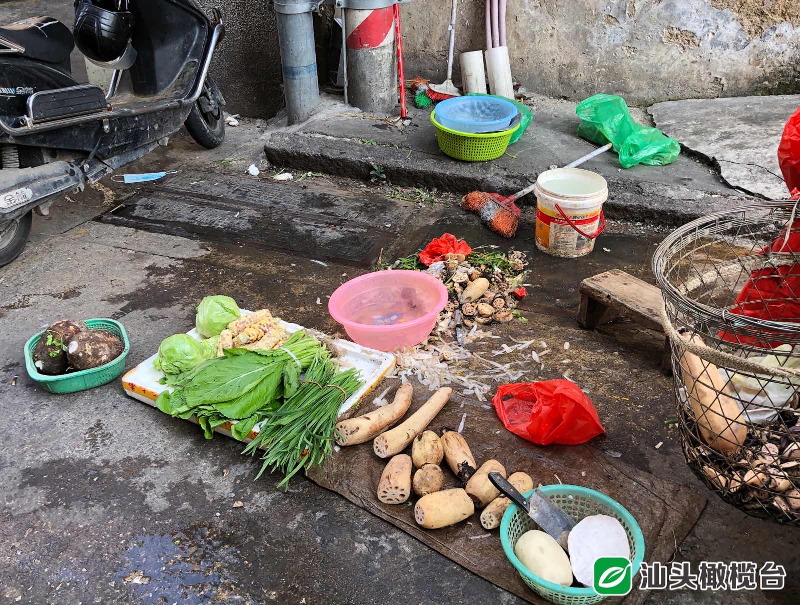 ◆“澄海蘇南鵝肉連鎖”門口有流動(dòng)攤販占道售賣蔬菜,對(duì)面一家水果茶葉批發(fā)店將貨物擺放在人行步道,影響行人通行。